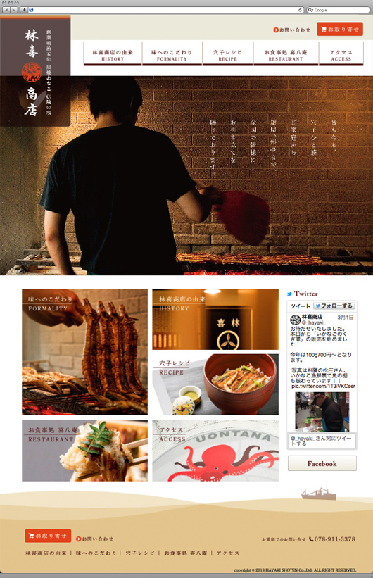 明治5年より続く、明石・魚の棚にある炭火焼あなご屋のホームページを制作。伝統とこだわりを表現しながら、ブログやレシピなどのコンテンツも取り入れる。撮影・コピーライティングからデザイン・HTML構築までトータルに制作。